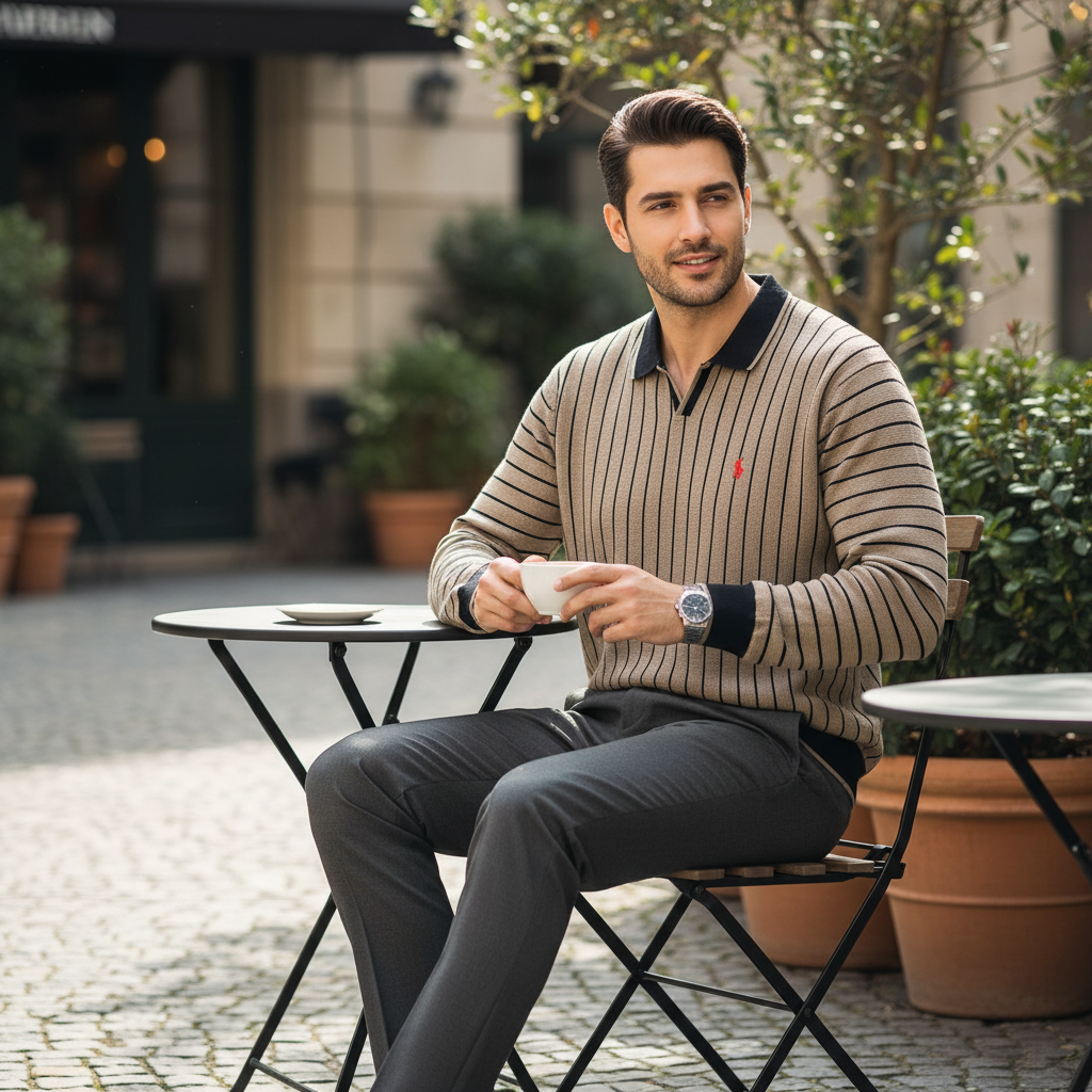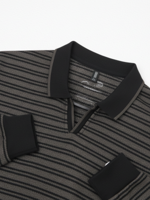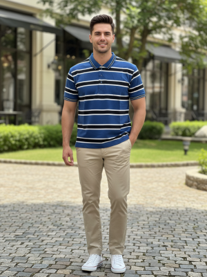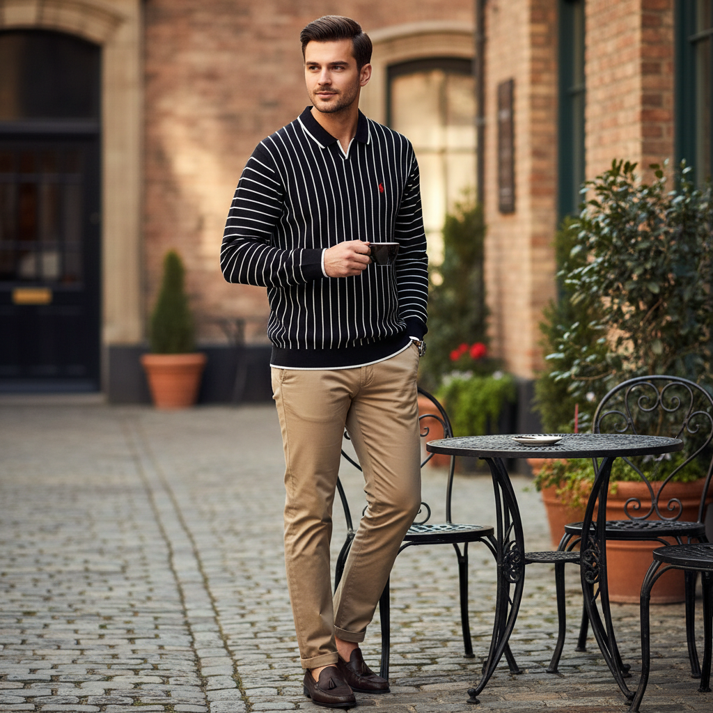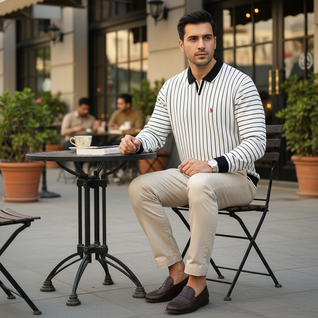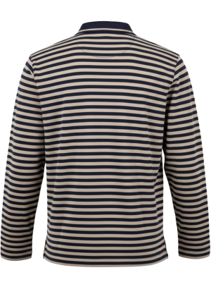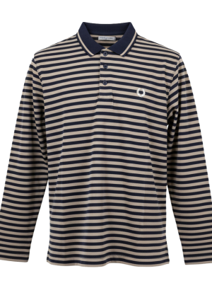 Beige & Navy Full-Sleeve Cotton Striped Polo Shirt