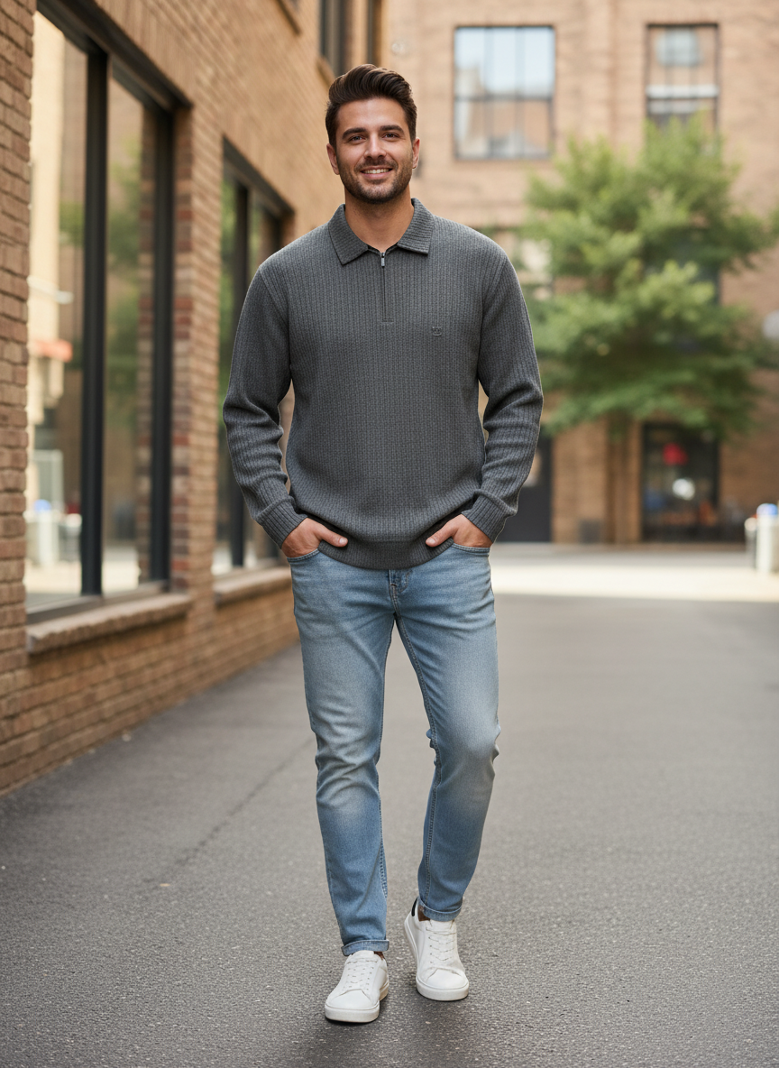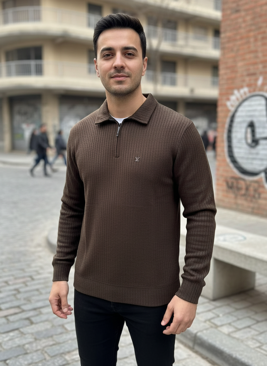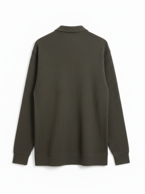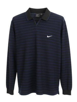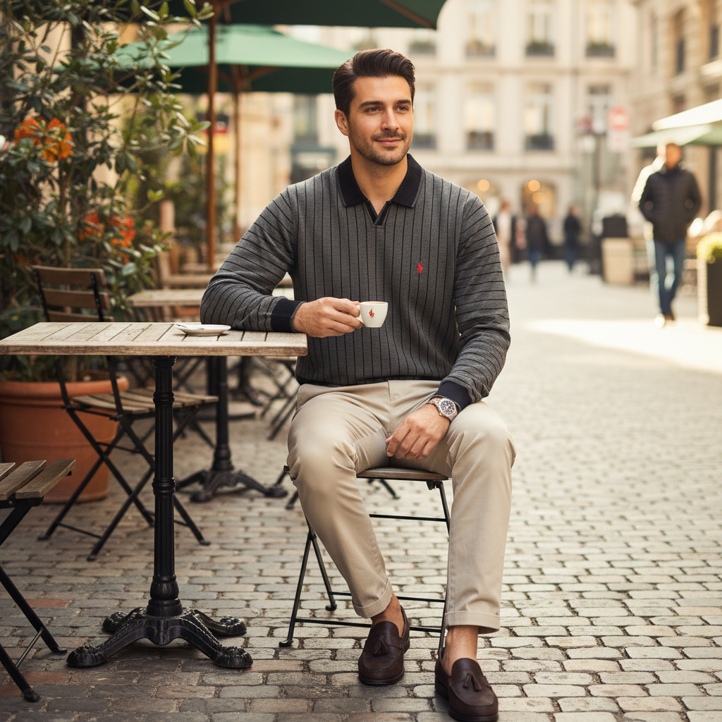Beige & Navy Full-Sleeve Cotton Striped Polo Shirt
