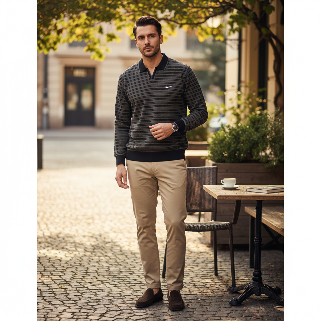 Charcoal grey and camel complete this horizontal stripe collection with versatile neutrals that serve as wardrobe foundations. The charcoal grey offers a sophisticated alternative to black, providing depth without the severity, while the camel brings warmth and approachability to any ensemble. The double-line horizontal stripe pattern creates a distinctive signature across all colorways, ensuring brand recognition while allowing individual expression through color choice. These shirts are designed for the discerning customer who appreciates subtle details and understands that true luxury lies in quality construction, premium materials, and timeless design rather than conspicuous branding or trendy embellishments.