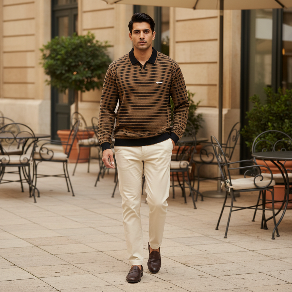 Johny Collar Old Money Horizontal Striped Full Sleeves Shirt – Camel Base with Black Double Lines