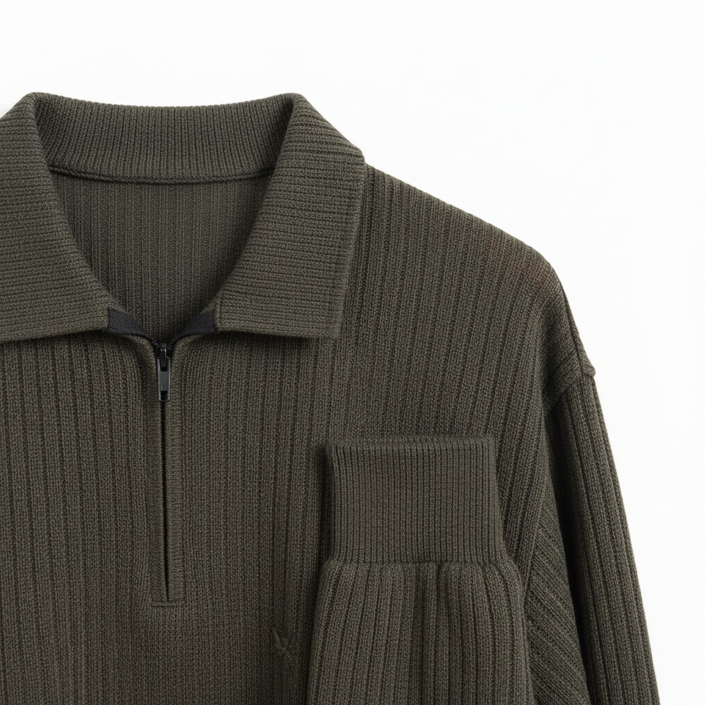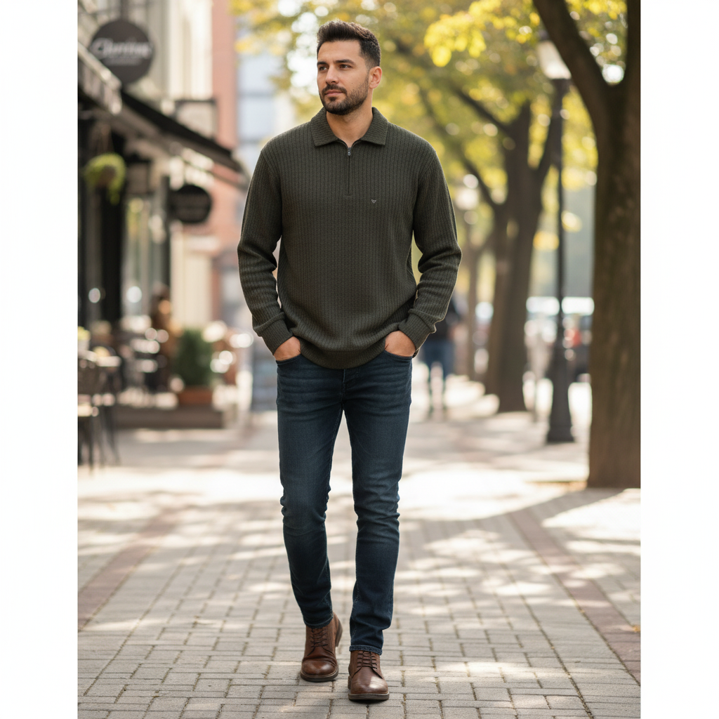The zipped polo represents a contemporary evolution of traditional knitwear, combining the casual elegance of a polo shirt with the practical functionality of a zip closure. The textured knit fabric adds tactile interest and visual depth, creating dimension that catches light and draws the eye. This texture also contributes to the garment’s warmth and structure, ensuring it maintains its shape while providing comfortable stretch. The full-length zipper offers versatility in styling and temperature regulation, allowing the wearer to adjust coverage as needed throughout the day. These pieces bridge the gap between athletic-inspired casualwear and refined smart-casual dressing, making them ideal for modern lifestyles that demand versatility without compromising on style.