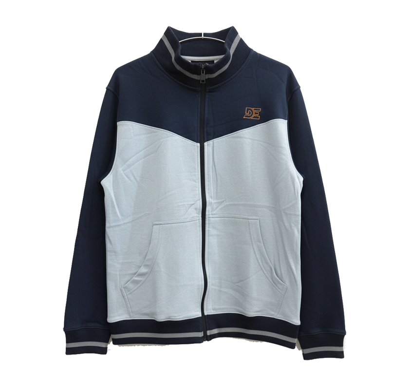 Perfect for crisp days, this navy and light grey fleece sweatshirt features a full front zipper, ribbed mock neck, and soft inner lining. The understated DE chest logo and dark/light color block design give it a refined sporty look for gym or daily wear.